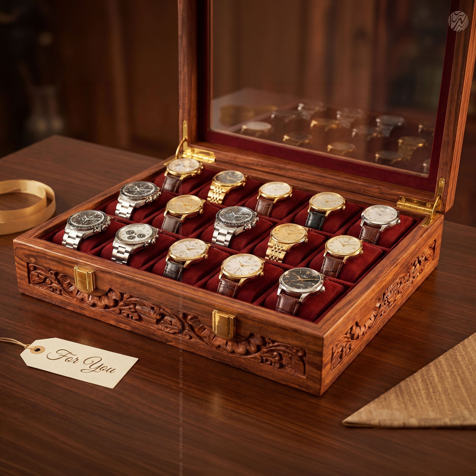 Premium 15 Slot Wooden Watch Box with Carving | Woodenxa