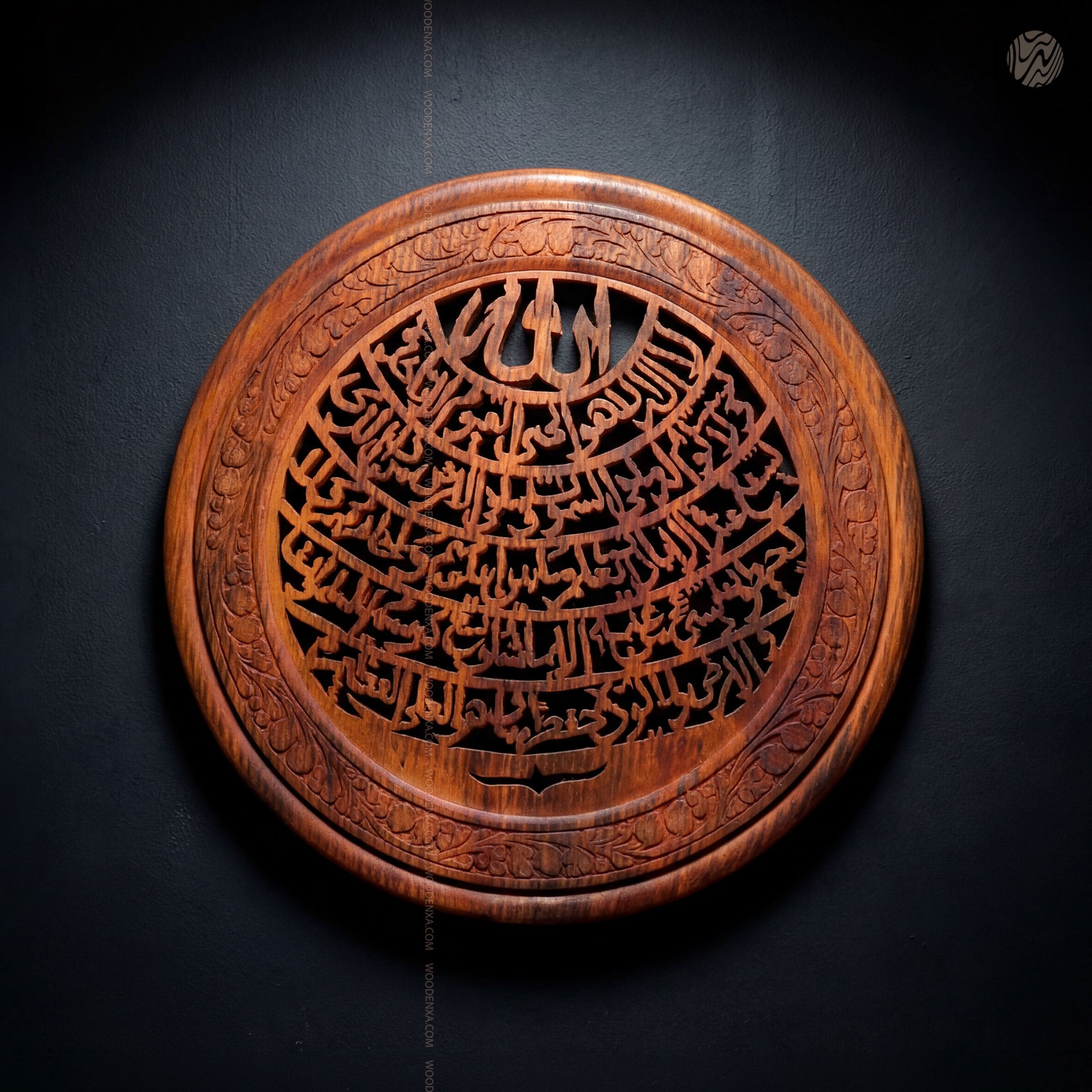 Bring spiritual elegance and timeless beauty to your space with this 18 Inch Handcrafted Wooden Ayatul Kursi Wall Art by Woodenxa. Expertly carved from solid natural wood, this round Islamic décor piece features beautifully detailed Arabic calligraphy of Ayatul Kursi, surrounded by an intricately engraved border that enhances its rich traditional appeal.