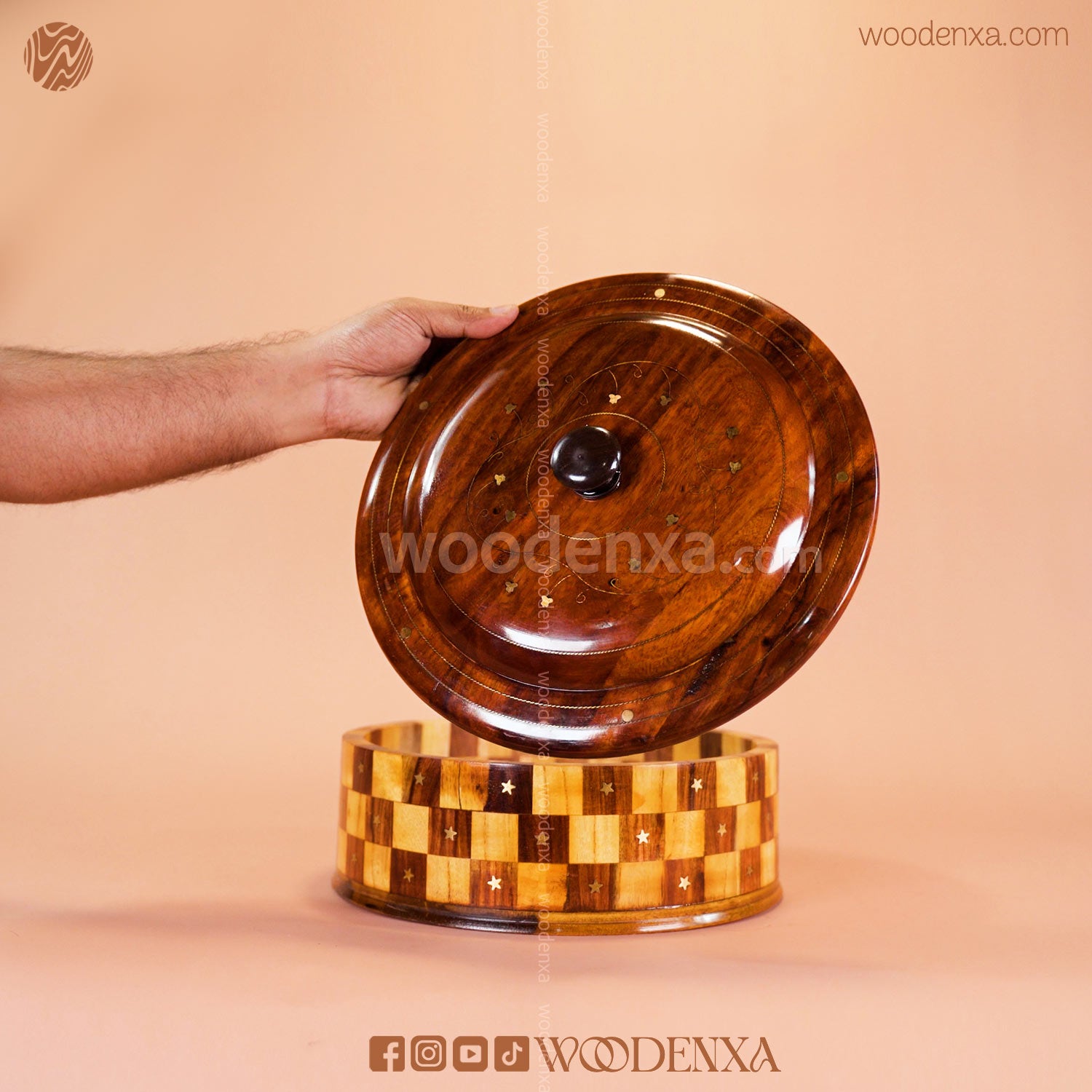 The intricate brass detailing and rich wooden finish provide a classic look, making it perfect for family dinners, gatherings, or special occasions. Durable, stylish, and practical, this hot pot is a beautiful example of handcrafted wooden kitchenware that blends art and utility seamlessly.